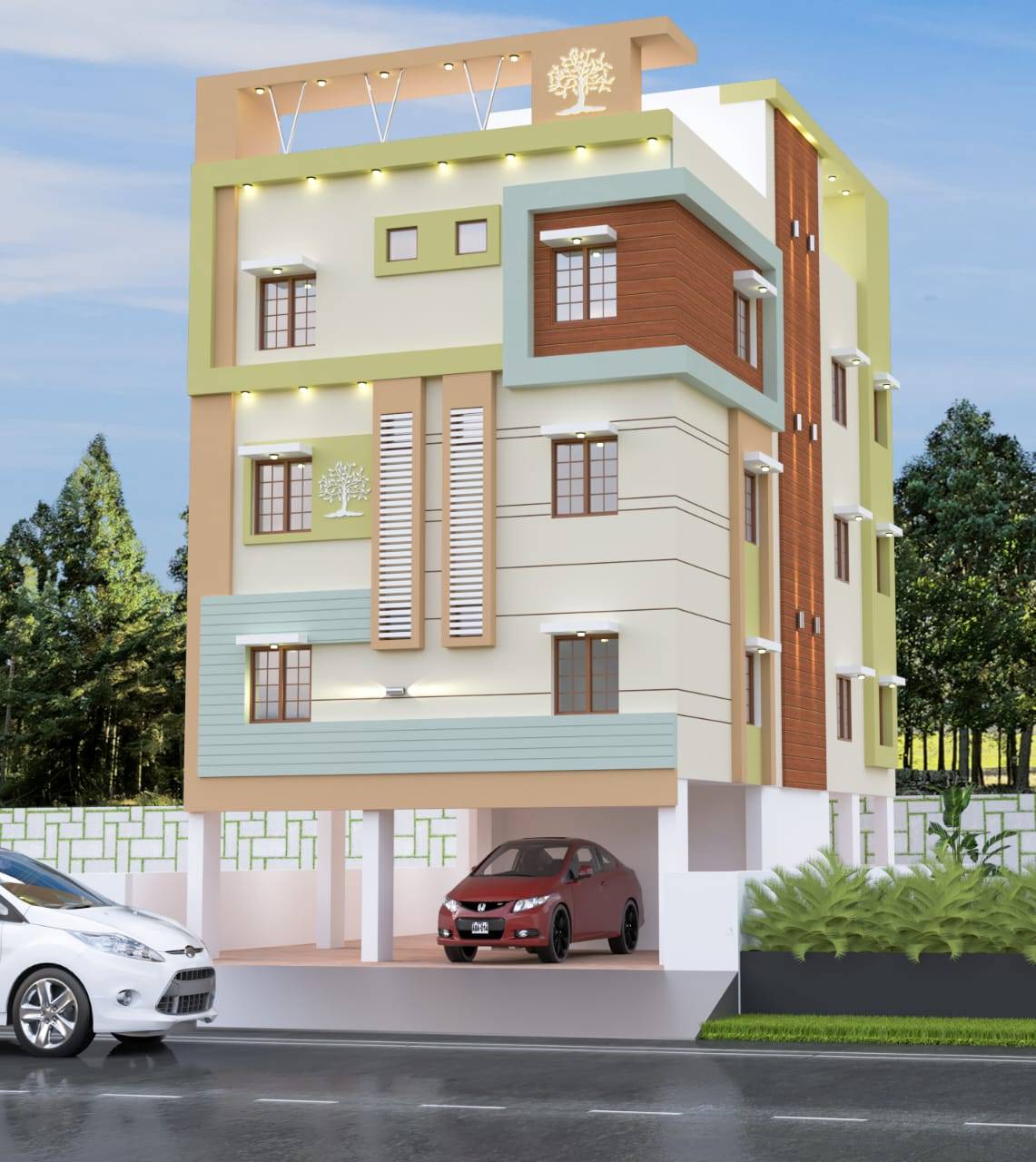 For this commercial project, the elevation integrates branding elements with architectural innovation. High-quality materials and precise detailing create a strong presence, enhancing the building’s visibility and professional image.