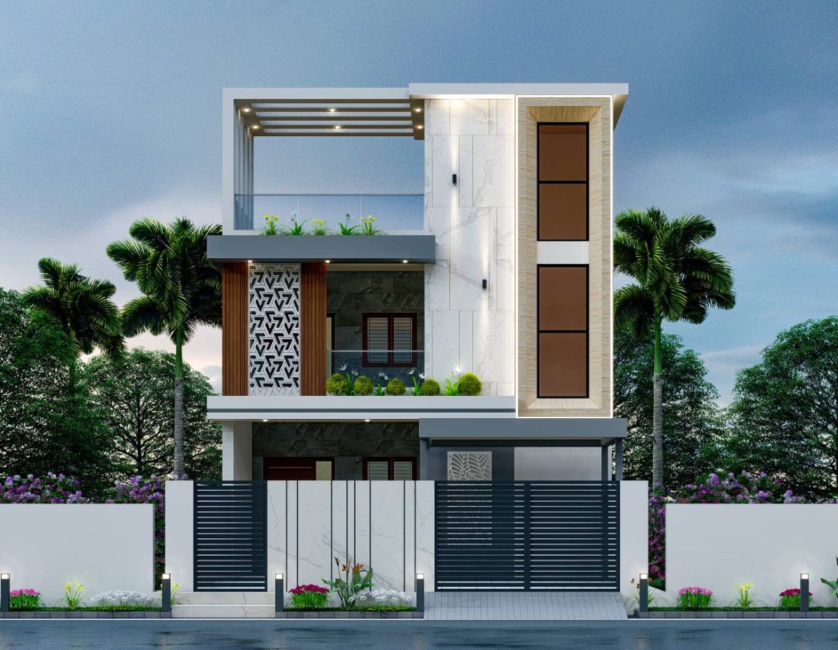 This modern elevation showcases clean lines, minimalist design, and a balanced composition of glass and concrete elements. The focus was on creating a contemporary visual identity while ensuring functionality and energy efficiency.