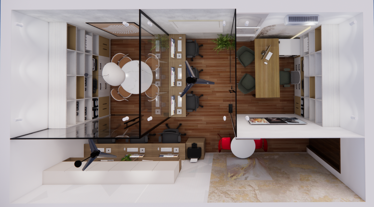 Our office interior design portfolio represents a fusion of modern aesthetics and strategic functionality. Using advanced 3D visualization techniques, we create workspaces that inspire productivity, encourage collaboration, and showcase cutting-edge design. Each project is crafted with meticulous attention to detail and quality finishes.