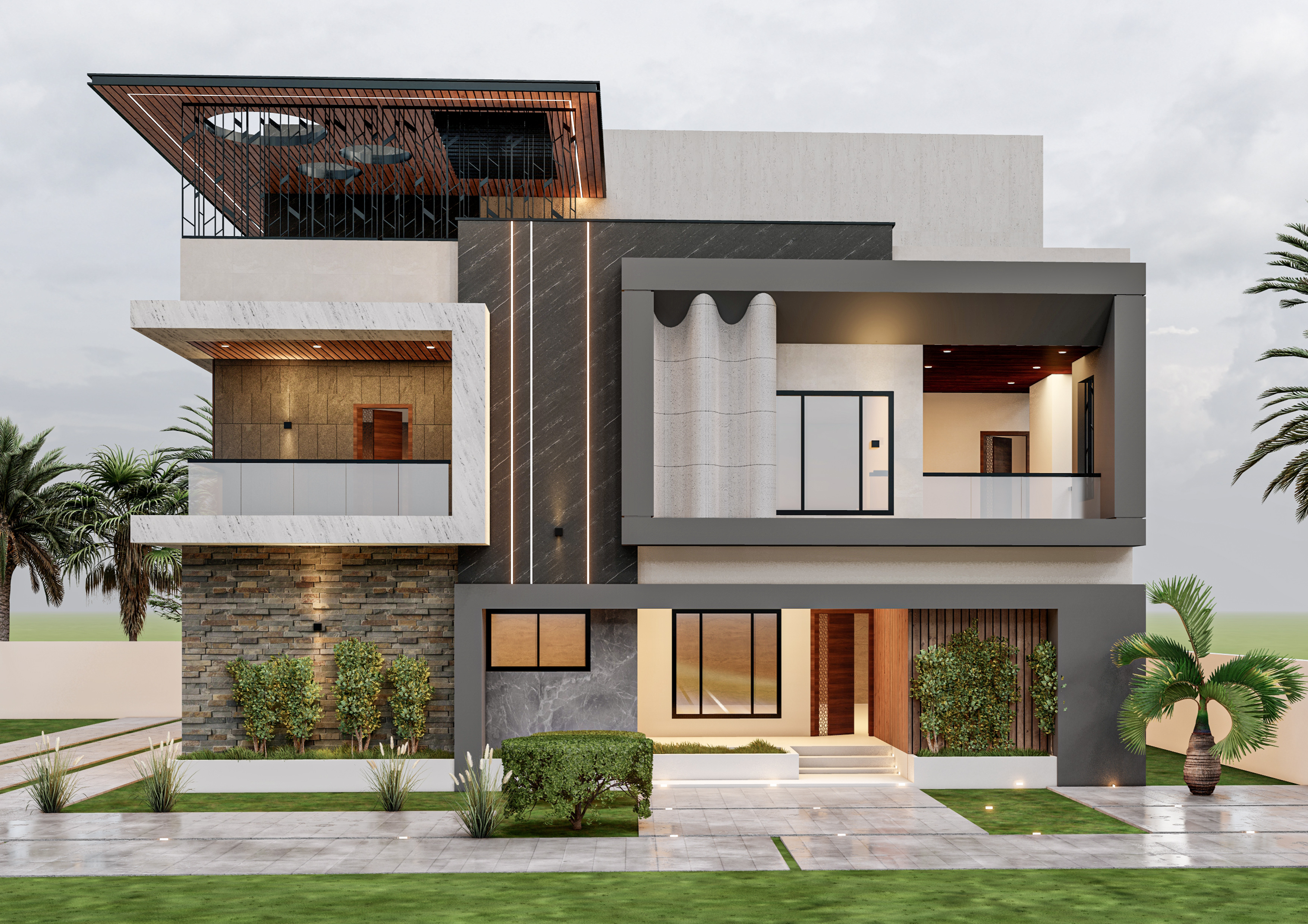 A strong emphasis is placed on functionality alongside aesthetics, with shaded balconies, recessed openings, and strategic overhangs improving comfort and energy efficiency. The integration of glass railings and warm ambient lighting softens the overall form, creating a welcoming and elegant facade. The result is a thoughtfully designed elevation that stands out for its modern appeal, material richness, and harmonious balance of form and function.
