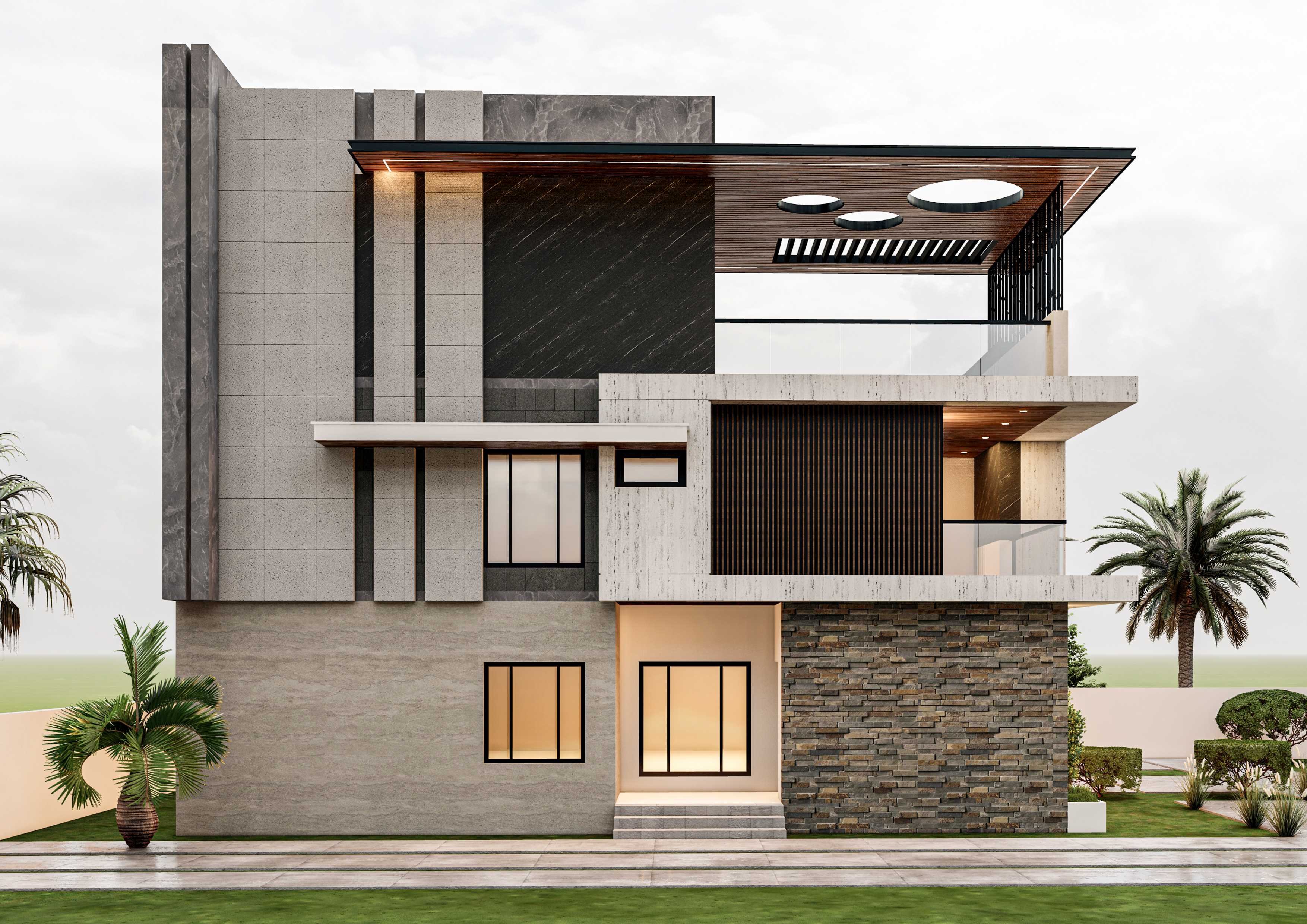This elevation design is defined by a bold interplay of volumes, textures, and horizontal projections that create a striking contemporary identity. The composition balances solid masses with open elements, using a refined palette of stone cladding, textured concrete, and wood-finish accents to achieve depth and contrast. Vertical fins and layered planes enhance the visual rhythm, while the extended roof canopy with circular cut-out features adds a distinctive architectural character.