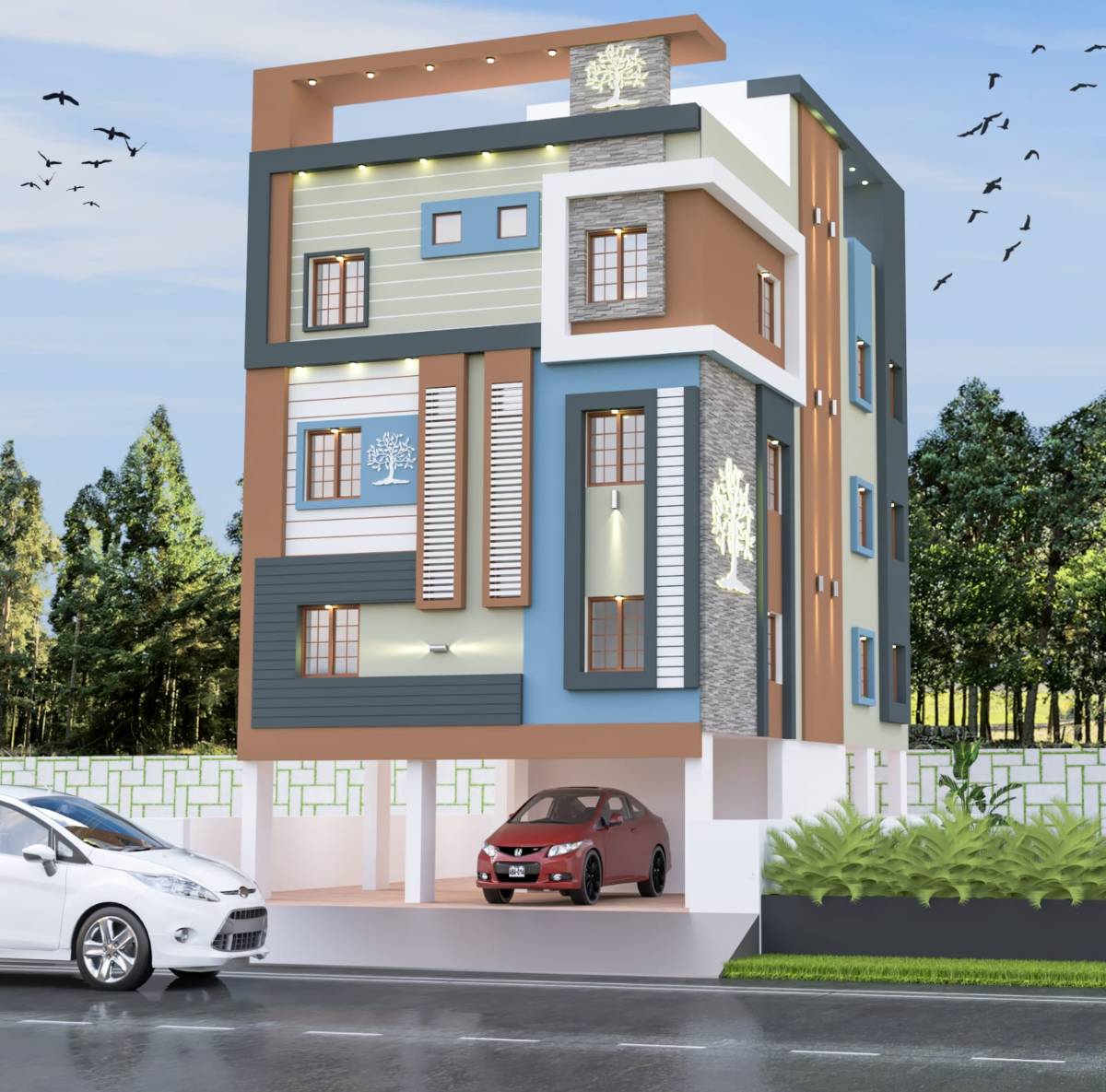 For this commercial project, the elevation integrates branding elements with architectural innovation. High-quality materials and precise detailing create a strong presence, enhancing the building’s visibility and professional image.